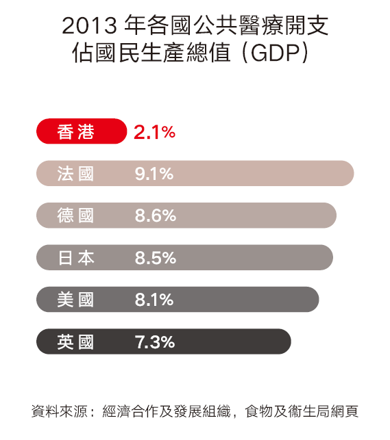 公營醫療開支佔國民生產總值也是不斷下降。當年政府話財赤,向醫療開刀,2004年開始佔GDP百分比一直下降,十年間徘徊於2.2%至2.3%之間,至2013年才開始上升回到3.2%。但是,若計算人口老化,全球醫藥費用上升等因素,開支仍是不足,更遠低於「經濟合作及發展組織」的國家平均水平6.5%。