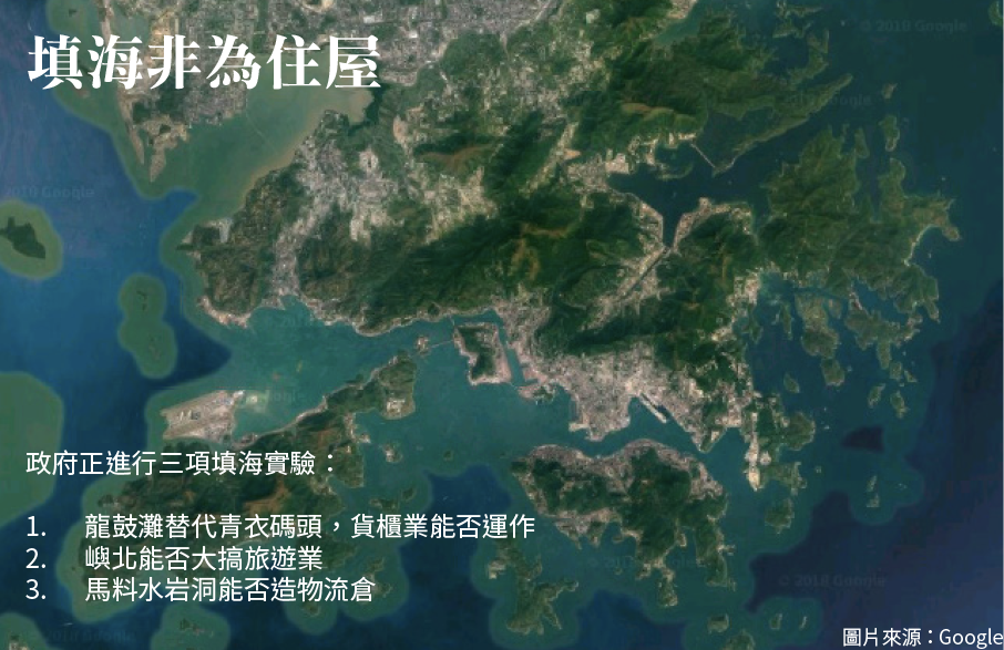所為何來?政府說,二十年後人囗增加一百萬,短缺千二公頃土地,無法提供職位和住房,因此必須填海造地。但是,其一政府的人口增長和土地需求推測都沒有堅實的根據。所謂人口增長估算存在極大誤差,以往就曾多次高估人口增長,浪費資源。至於所謂土地需求推算,亦只是叫各政策局上報,估計二十年後需要多少土地,然後加出一個總數便做報告,但查實有些局長根本並沒有上報,預測並沒有根據。